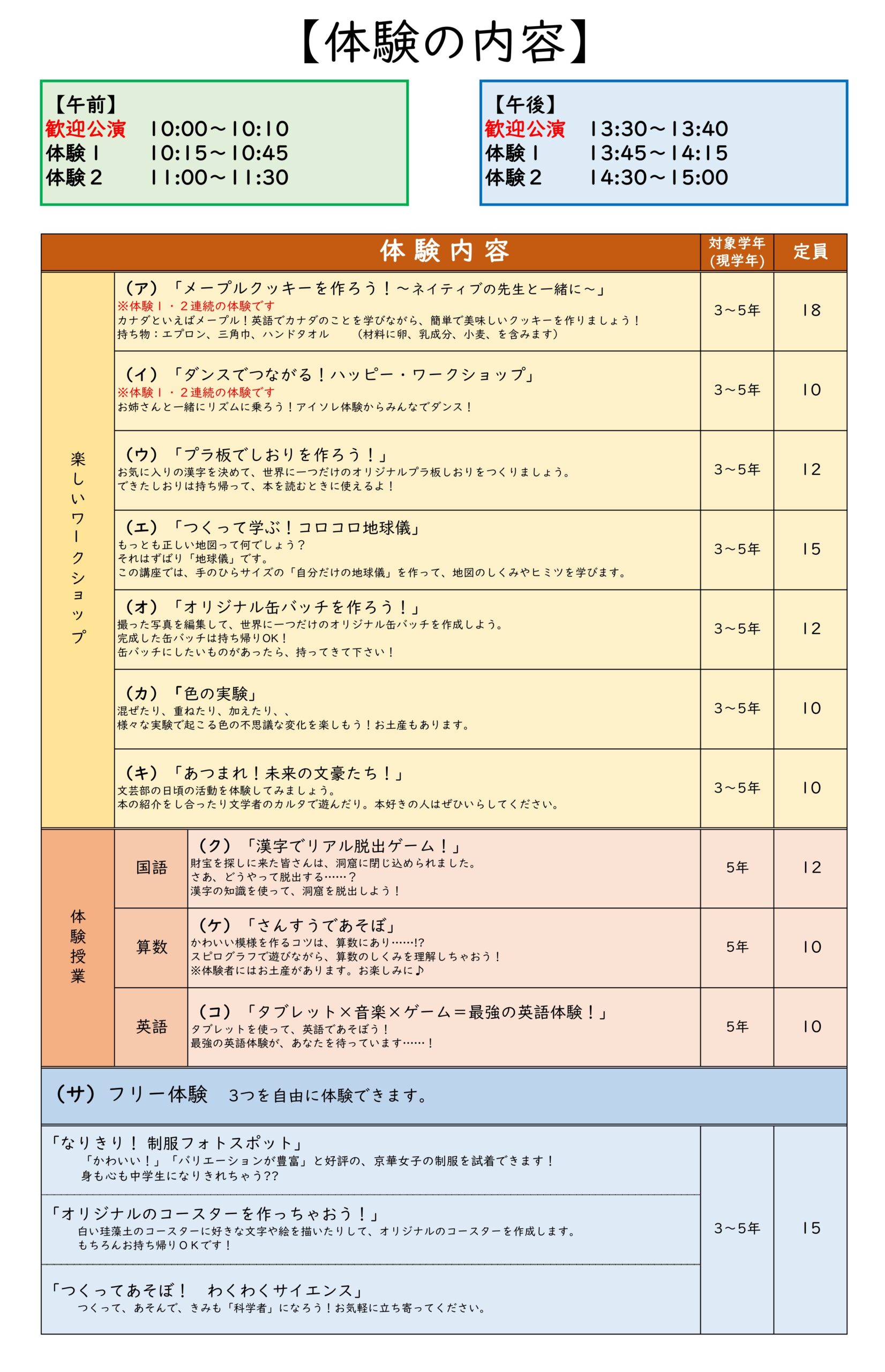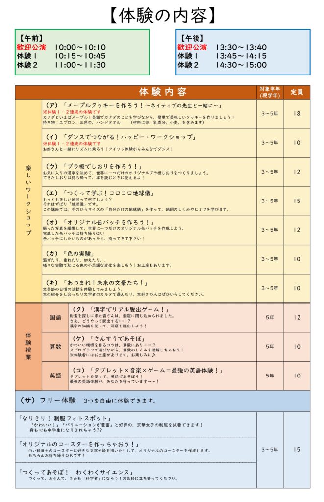 現5年生向けの体験授業のほか、4年生以下の皆さんも参加できるワークショップも多数用意しています。